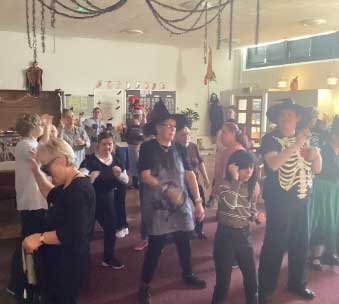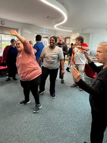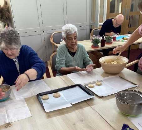 There have been several baking sessions making cookies, and some clients were able to benefit from a visit by BC Independent Living who came in to give a healthy cookery lesson. Craft work has produced some lovely yarn autumn leaves, some beautiful artwork using buttons and lots of spooky items for Halloween. Others were content to have a session of knitting and chatting to their companions, and we have had George & Mike in for a drumming workshop.